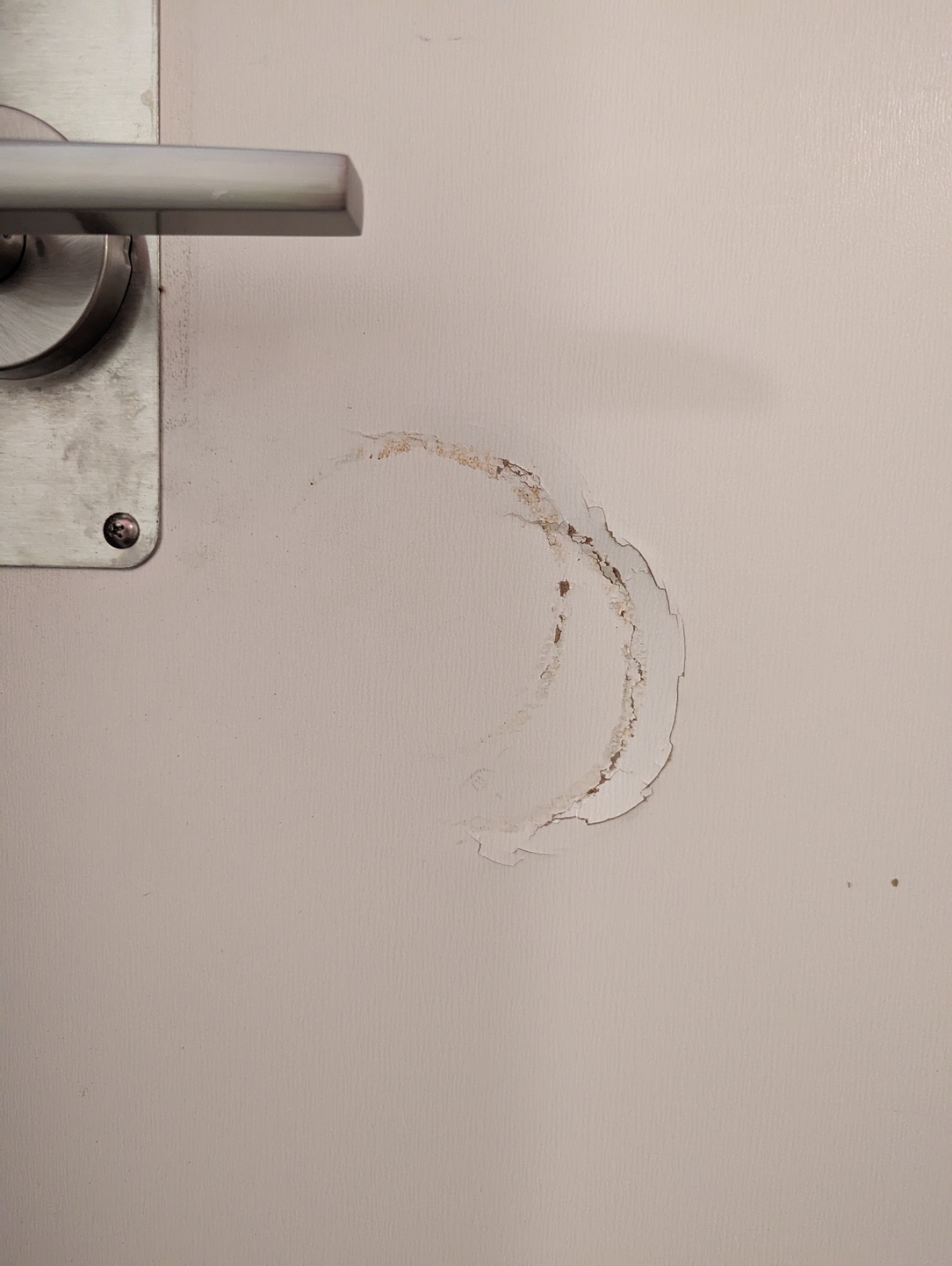 The damage to my apartment door caused by the police using a battering ram.