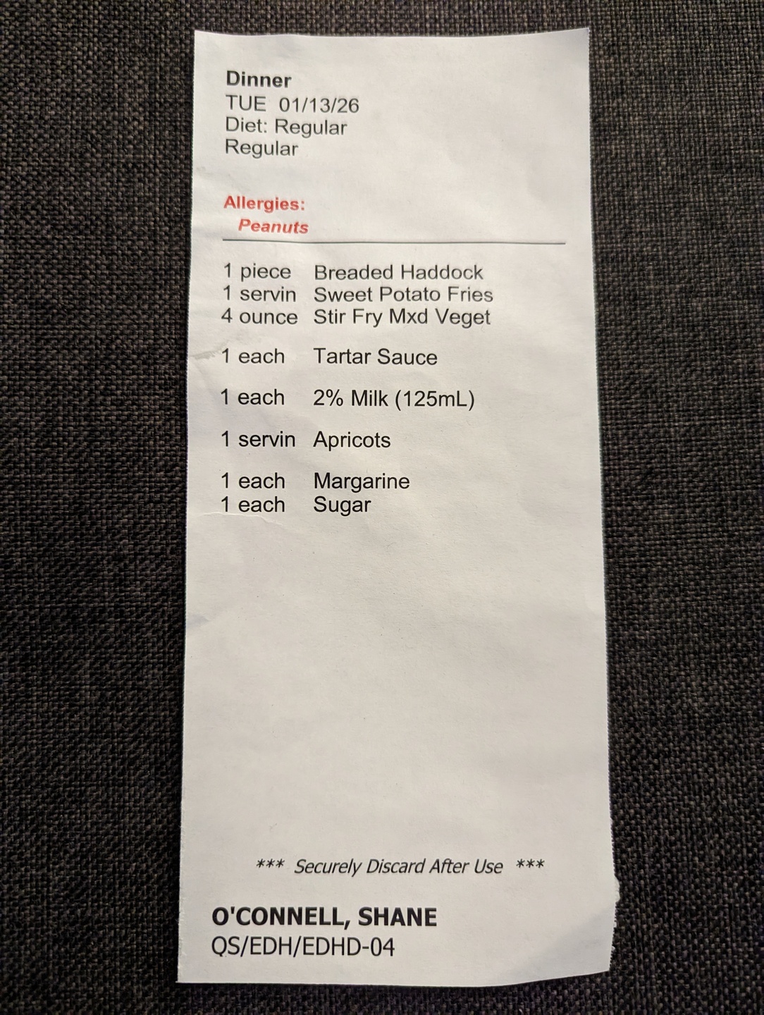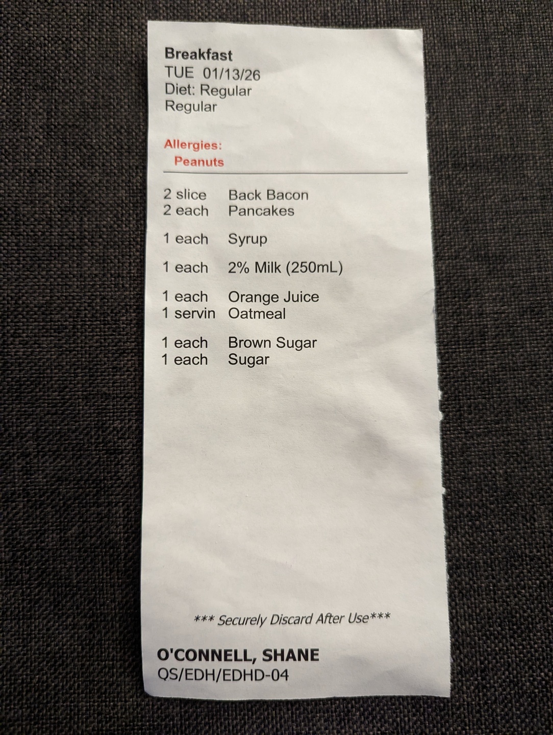 These are some receipts for two of the meals I had when I was at CAMH. I was never asked what I wanted to eat, they would just bring something. I have no idea why it says that I have a peanut allergy, because it is not true. I like peanut butter and consume it regularly. Maybe my parents told CAMH that I had a peanut allergy just to mess with me in some way.