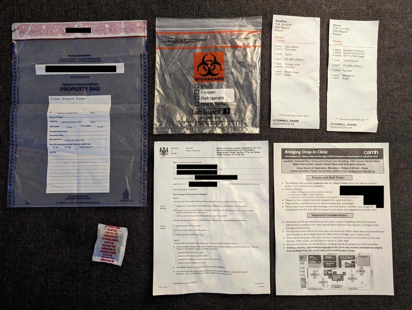 This photo contains everything that I was given to take with me after leaving CAMH. The social worker gave me their business card, however I lost it on the way home.