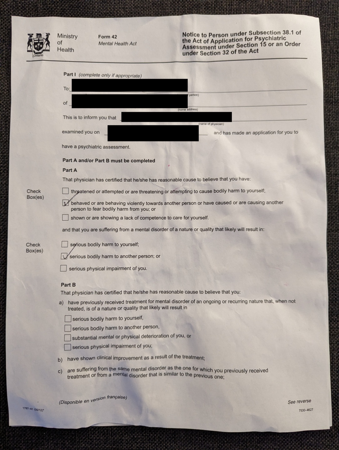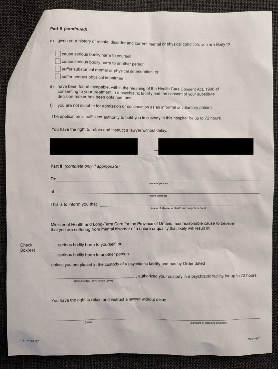 The form that was filled out to justify why I had to be held for 72 hours after arriving at CAMH. I have covered up all of the handwritten information in order to hide the identity of the doctor that filled out the form. Under the black boxes, the form has my name and specifies a date of 2026-01-12.