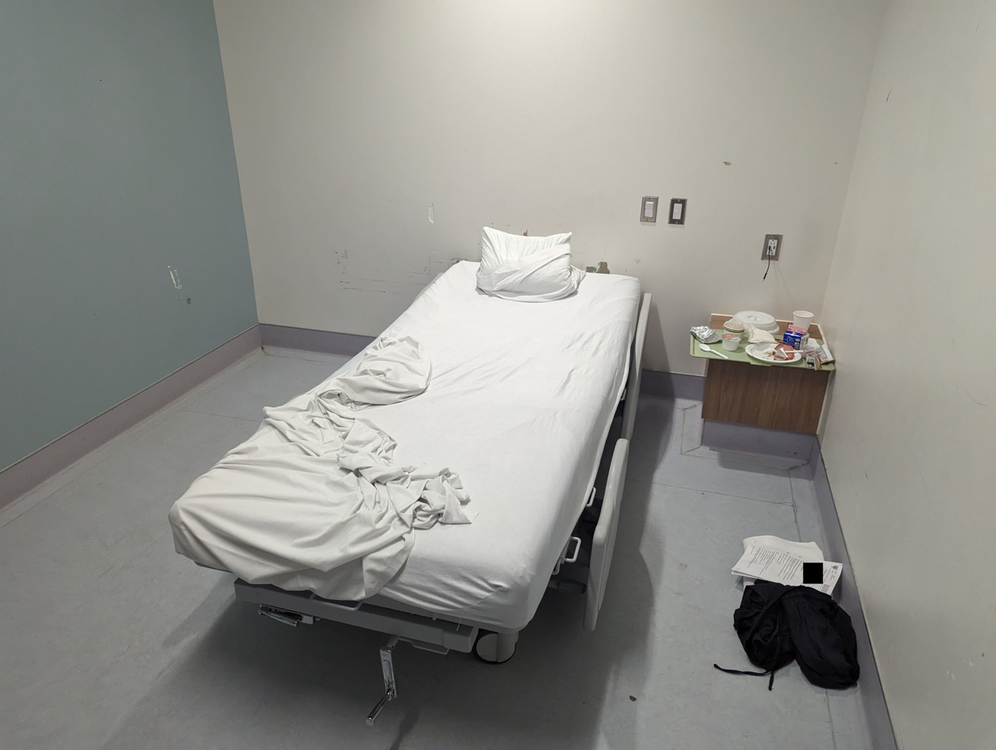 The private room was very basic, containing only a bed and a table. There was an outlet with a USB port above the table, however I did not have a cable, so I did not charge my phone during the first night. Once morning came, I asked a CAMH employee about it, and they were able to provide me with a short USB cable. Unfortunately, the cord was so short that it was shorter than the distance from the outlet to the table. I had to prop up the phone using one of the containers that food had arrived in, so that the cord could reach the outlet.